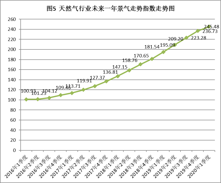 2020年1季度統計的天然氣行業未來一年景氣走勢指數為245.48 ,預計未來一年天然氣行業處于很景氣狀態。本季度與2019年4季度的預測值236.73 相比,有大幅度上升,其季度變動系數為 1.037 。其中,天然氣行業專家、天然氣生產企業相關專家、天然氣銷售公司相關專家對天然氣行業未來一年景氣走勢判斷,均持樂觀態度。詳見圖5及表1。