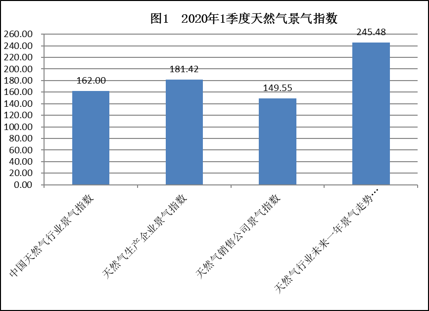 中國天然氣行業景氣指數統計結果顯示:2020年1季度中國天然氣行業景氣指數為162.00,處于景氣狀態;天然氣生產企業景氣指數為181.42,處于景氣狀態;天然氣銷售公司景氣指數為149.55,處于較景氣狀態;天然氣行業未來一年景氣走勢指數為245.48,處于很景氣狀態。詳見圖1及表1。