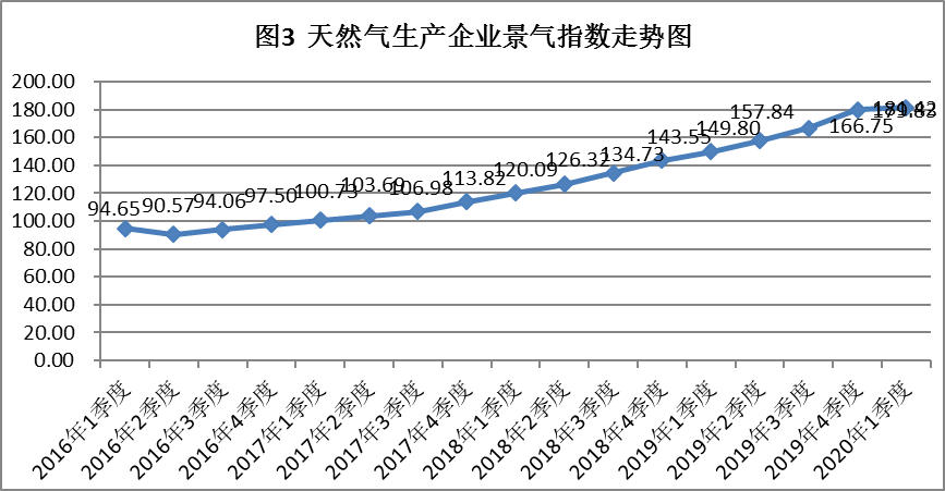 2020年1季度國內天然氣生產企業運營狀況有所改善,天然氣生產企業景氣指數為 181.42 ,處于景氣狀態。本季度與2019年4季度相比有小幅度上升,季節景氣變動系數為1.009 。其中產能利用和經營狀況較上季度有小幅度上升,就業人員基本保持不變,價格水平、投資水平、員工收入、產能變化和企業產量較上季度有小幅度下降。詳見圖3及表1。