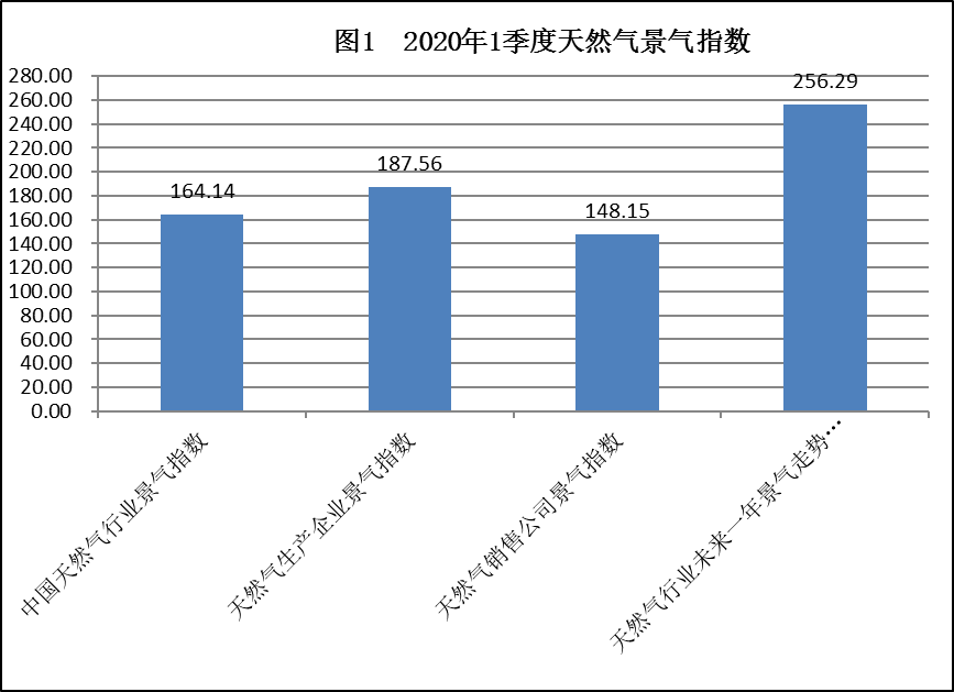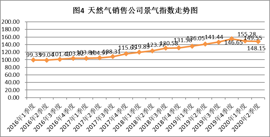 中國天然氣行業(yè)景氣指數(shù)統(tǒng)計結(jié)果顯示:2020年2季度中國天然氣行業(yè)景氣指數(shù)為164.14,處于景氣狀態(tài);天然氣生產(chǎn)企業(yè)景氣指數(shù)為187.56,處于景氣狀態(tài);天然氣銷售公司景氣指數(shù)為148.15,處于較景氣狀態(tài);天然氣行業(yè)未來一年景氣走勢指數(shù)為256.29,處于非常景氣狀態(tài)。詳見圖1及表1。