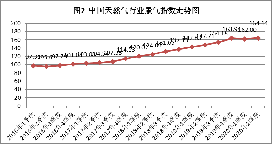 2020年 2季度中國天然氣行業(yè)景氣指數(shù)為164.14 ,處于景氣狀態(tài)。本季度與2020年1季度相比有一定幅度上升,景氣變動系數(shù)為1.013。在評價天然氣行業(yè)景氣狀態(tài)的五大指標(biāo)中,宏觀經(jīng)濟指標(biāo)基本保持不變,天然氣行業(yè)專家判斷指標(biāo)和天然氣生產(chǎn)企業(yè)經(jīng)營狀態(tài)指標(biāo)出現(xiàn)小幅度上升,天然氣進口狀態(tài)指標(biāo)和天然氣銷售公司經(jīng)營狀態(tài)指標(biāo)出現(xiàn)一定幅度下降。總體來看,2020年2季度中國天然氣行業(yè)景氣指數(shù)呈現(xiàn)上升態(tài)勢。詳見圖2及表1。