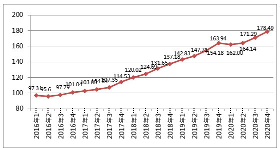 2020年 4季度中國天然氣行業景氣指數為178.49 ,處于景氣狀態。本季度與2020年3季度相比一定幅度上升,景氣變動系數為1.042。在評價天然氣行業景氣狀態的五大指標中,宏觀經濟指標基本保持不變,天然氣進口狀態指標和天然氣生產企業經營狀態指標出現小幅度上升,天然氣銷售公司經營狀態指標出現一定幅度上升,天然氣行業專家判斷指標出現較大幅度上升。總體來看,2020年4季度中國天然氣行業景氣指數呈現上升態勢。詳見圖2及表1。