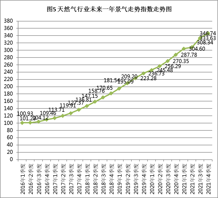 2021年4季度統計的天然氣行業未來一年景氣走勢指數為346.74,預計未來一年天然氣行業處于很景氣狀態。本季度與2021年3季度的預測值333.63相比,有小幅上升,景氣變動系數為1.039。其中,天然氣行業專家、天然氣生產企業相關專家和天然氣銷售公司相關專家對天然氣行業未來一年景氣走勢判斷均持樂觀態度。詳見圖5及表1。