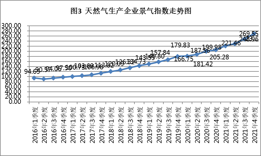 2021年4季度國內天然氣生產企業運營狀況有所改善,天然氣生產企業景氣指數為269.55,處于很景氣狀態。本季度與2021年3季度相比出現大幅度上升,景氣變動系數為1.083。其中就業人員較上季度并無變化,員工收入較上季度有微幅上升,投資水平較上季度有一定幅度上升,價格變化較上季度有較大幅度上升,產能變化、產能利用、企業產量及經營狀況較上季度有較大幅度上升。詳見圖3及表1。