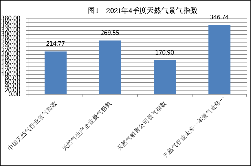 中國天然氣行業景氣指數統計結果顯示:2021年4季度中國天然氣行業景氣指數為214.77,處于很景氣狀態;天然氣生產企業景氣指數為269.55,處于很景氣狀態;天然氣銷售公司景氣指數為170.90,處于景氣狀態;天然氣行業未來一年景氣走勢指數為346.74,處于很景氣狀態。詳見圖1及表1。