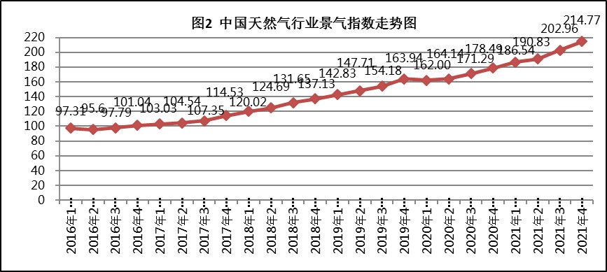 2021年4季度中國天然氣行業景氣指數為214.77,處于很景氣狀態。本季度與2021年3季度相比存在一定幅度上升,景氣變動系數為1.058。在評價天然氣行業景氣狀態的五大指標中,天然氣進口狀態出現微幅下降,宏觀經濟指標基本保持不變,天然氣銷售公司經營狀態指標出現小幅上升,天然氣行業專家判斷指標和天然氣生產企業經營狀態均出現較大幅度上升。總體來看,2021年4季度中國天然氣行業景氣指數呈現上升態勢。詳見圖2及表1。
