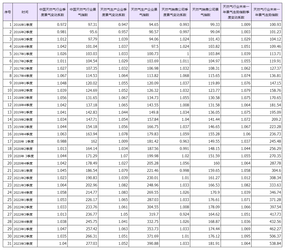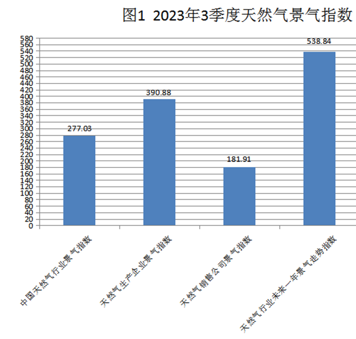 中國天然氣行業景氣指數統計結果顯示:2023年3季度中國天然氣行業景氣指數為277.03,比2023年2季度增長4.0%,短期內天然氣行業景氣狀態比較穩定,中長期仍然處于很景氣狀態;2023年3季度天然氣生產企業景氣指數為390.88,比2023年2季度增長5.2%,短期內天然氣生產企業景氣狀態持續提升,中長期處于很景氣狀態;2023年3季度天然氣銷售公司景氣指數為181.91,比2023年2季度增長3.3%,短期內天然氣銷售公司景氣狀態有所回升,中長期仍然處于景氣狀態;2023年3季度天然氣行業未來一年景氣走勢指數為538.84,比2023年2季度增長6.4%,處于很景氣狀態,表明行業專家對天然氣行業未來一年景氣走勢持續穩定看好。詳見圖1及表1。