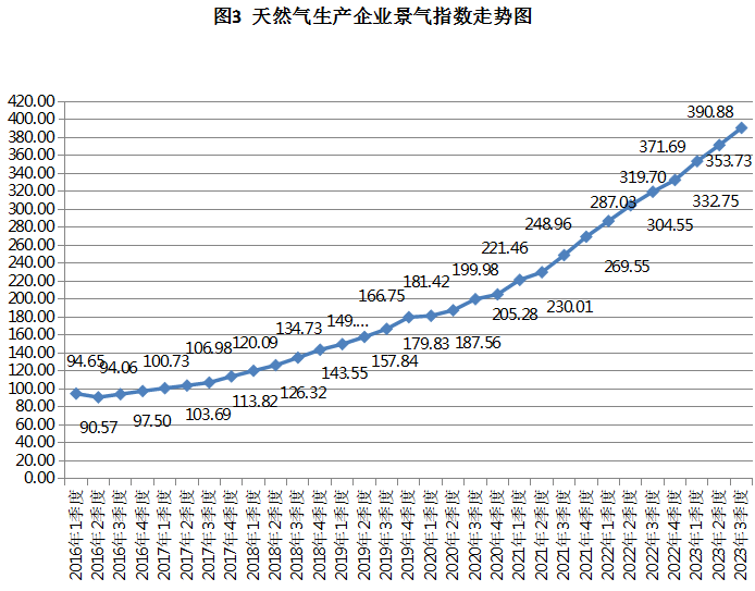 2023年3季度國內天然氣生產企業運營狀況有所改善,天然氣生產企業景氣指數為390.88,處于很景氣狀態。本季度與2023年2季度相比出現一定幅度上升,景氣變動系數為1.052。其中價格變化、就業人員、員工收入較上季度有微幅上升,投資水平、產能利用、產能變化、經營狀況較上季度有小幅上升,企業產量較上季度有較大幅度上升。詳見圖3及表1。