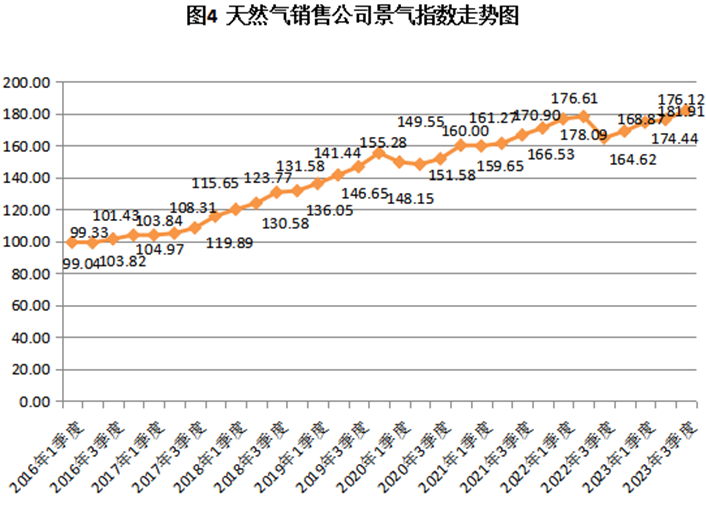 2023年3季度天然氣銷售公司景氣指數為181.91,處于景氣狀態。本季度與2023年2季度相比有小幅上升,景氣變動系數為1.033。其中,供求狀態較上季度有微幅下降,就業人員、價格變化較上季度微幅上升,員工收入、經營狀況較上季度有小幅上升,產品銷量較上季度有一定幅度上升。詳見圖4及表1。