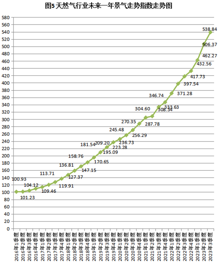 2023年3季度統計的天然氣行業未來一年景氣走勢指數為538.84,預計未來一年天然氣行業處于很景氣狀態。本季度與2023年2季度的預測值506.37相比,有較大幅度上升,景氣變動系數為1.064。其中,天然氣行業專家、天然氣生產企業相關專家及天然氣銷售公司相關專家對天然氣行業未來一年景氣走勢判斷均持樂觀態度。詳見圖5及表1。