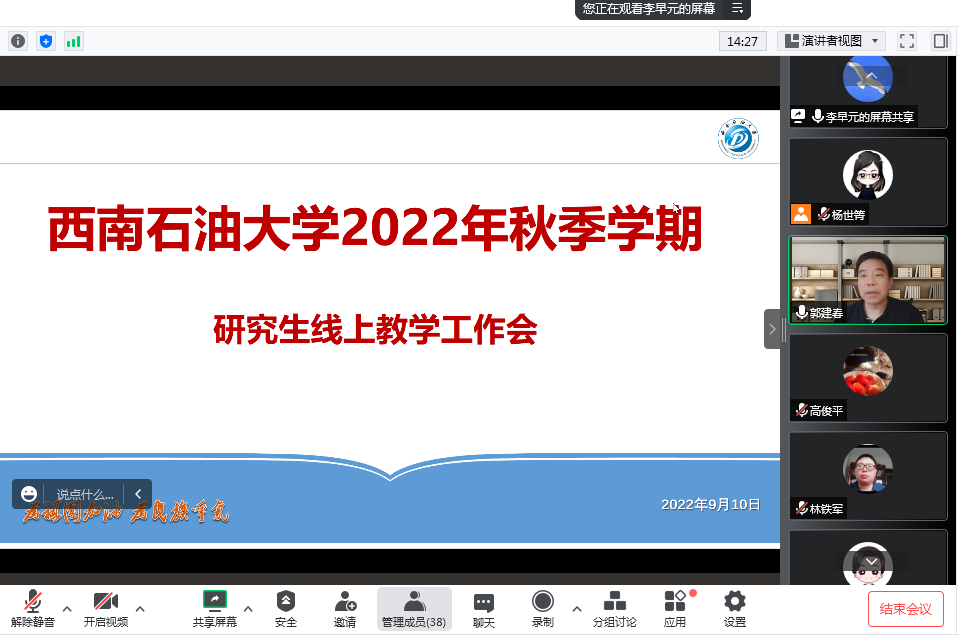 9月10日下午,學校組織召開2022年秋季學期開學研究生線上教學工作視頻會議,學校黨委常務、副校長郭建春出席會議。郭建春強調,一定要高度重視、廣泛動員和順利推動線上教學實施。