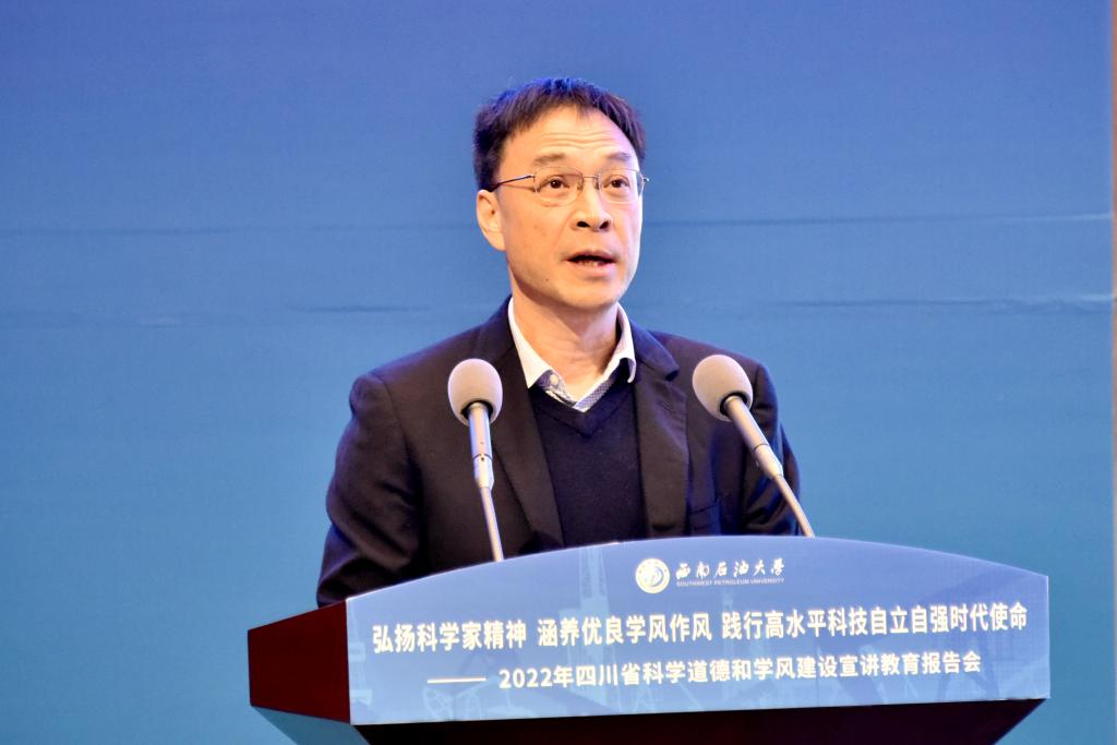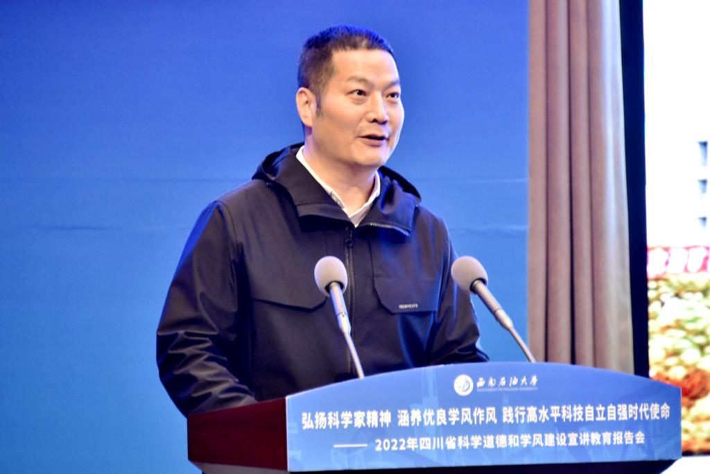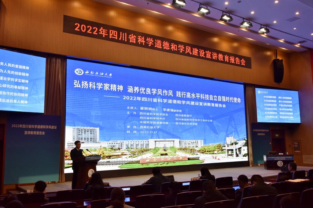 11月17日,2022年四川省科學道德和學風建設宣講教育報告會在我校舉行。本次報告會主題為“弘揚科學家精神 涵養優良學風作風 踐行高水平科技自立自強時代使命”,由四川省科學技術協會、教育廳、科學技術廳、國防科學技術工業辦公室,以及中國科學院成都分院、四川省社會科學院聯合主辦,西南石油大學承辦。會議通過四川觀察、中國科協“風啟學林”主題社區等網絡平臺,面向全省高校師生和相關單位科技工作者全程直播,僅四川觀察平臺就有276萬人觀看了報告會。