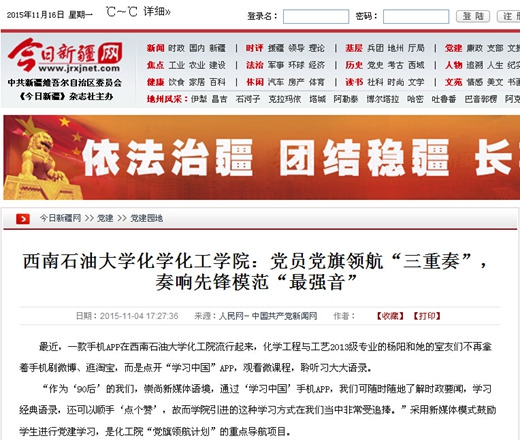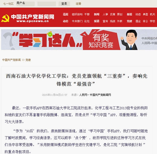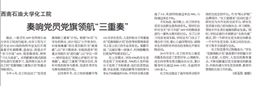 近日,人民網、教育導報、今日新疆網以《西南石油大學化學化工學院:黨員黨旗領航“三重奏”,奏響先鋒模范“最強音”》為題,報道了化工院黨旗領航活動。化工院黨委書記陳馥表示:“學生‘黨旗領航計劃’科學把握大學生入黨前、入黨時、入黨后的教育重點,不斷創新基層黨支部建設的新途徑,積極構建大學生黨員培養、教育和管理的長效工作機制。 人民網:http://dangjian.people.com.cn/n/2015/1104/c117092-27776423.html 教育導報:http://jydb.newssc.org/page/259/2015-11/12/02/2015111202_pdf.pdf 今日新疆網:http://www.jrxjnet.com/building/2015-11/04/content_378152.htm