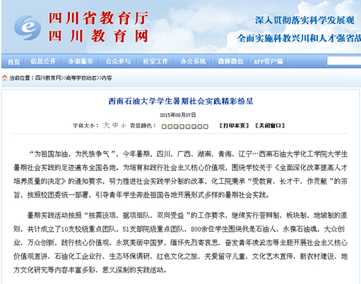 學院2015年暑期社會實踐按照“按需設項、據項組隊、雙向受益”的工作要求,繼續實行答辯制、板塊制、地域制的原則,共計成立了10支校級重點團隊,51支部院級重點團隊,800余位學生圍繞我是石油人、永葆石油魂,大眾創業、萬眾創新,踐行核心價值觀、永筑美麗中國夢,緬懷先烈寄哀思、奮發青年凌云志等主題開展社會主義核心價值觀宣講、石油化工企業行、生態環保調研、紅色文化之旅、關愛留守兒童、文化藝術宣傳、新農村建設、地方文化研究等內容豐富多彩、意義深刻的實踐活動。廣大同學的社會實踐活動先后得到人民網、中國共產黨新聞網、四川教育網、教育部中國大學生在線、中國高校之窗、中國大學生網、大學生活網、大學生聯盟網等媒體的報道。 2015年適逢中國人民抗日戰爭暨世界反法西斯戰爭勝利70周年,為引導青年學生主動、自覺地在社會實踐中學習“歷史課”,緬懷抗戰先烈,傳承革命精神,學院根據共青團中央學校部、人民日報社政文部、人民網關于“全國大學生紀念抗戰勝利70周年尋訪活動項目” 的通知要求,組織學生黨員、預備黨員、入黨積極分子成立了“化”說抗日情社會實踐隊奔赴南充、廣安、儀隴等革命老區開展尋訪抗戰老兵、祭奠烈士英魂、讀史銘記脊梁等主題活動。 化學工程2013級學生楊陽說道:經過這次與社會的近距離接觸,作為95后的我對大學的規劃有了深刻的感悟和體會,相信自己在以后的學習、生活中,定能記住這個暑假的點點滴滴,激勵自己,取得更好地成績。 學院黨委蒲冠州表示:社會實踐是大學生人才培養過程中的一個重要環節,是大學生理想信念教育工作的重要組成部分,學院歷來高度重視,并將此作為錘煉大學生品格、磨練大學生意志、提高大學生技能的重要抓手。 中國共產黨新聞網鏈接:http://cpc.people.com.cn/gqt/n/2015/0908/c363174-27557295.html 人民網鏈接:http://bbs1.people.com.cn/post/80/1/2/149546664.html 四川省教育廳網站鏈接:http://www.scedu.net/news/web/1441525383.shtml 教育部中國大學生在線鏈接:http://news.univs.cn/2015/0906/1106809.shtml
