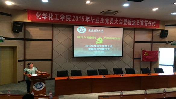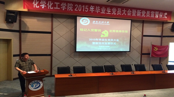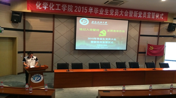6月11日上午,化工院在思學樓A114教室舉行“銘記入黨誓詞、發揮表率作用”學生黨員教育活動,化工院黨委委員、黨支部書記、2015屆畢業生黨員、新發展學生黨員參加了本次教育活動,活動由化工院團委書記張勇主持。 教育活動在雄壯的《國際歌》聲中拉開了序幕,化工院黨委副書記蒲冠州帶領新老黨員面向黨旗,高舉右拳,莊重地宣讀入黨誓詞,“我志愿加入中國共產黨,擁護黨的綱領,遵守黨的章程……”。 化工院教師黨員代表羅米娜發言,代表全院教師表達了對畢業生的難舍之情和祝福之意,對廣大與會學生黨員提了三點希望和要求:第一,定位自己,樹立奮斗目標,做一位成功的人;第二,誠信做人,踏實做事,做一位有事業心和責任感的人;第三,適應社會,調整自己,不斷修煉,做一位能力出眾和身心健康的人。 安全工程2011級李萌作為學生黨員代表發言,他回顧了大學生活夫人酸、甜、苦、辣,表達了對師長的感激、對父母的感恩和對母校的無限眷戀與祝福,表示將會牢記“化工人”的身份,帶著母校的教誨與祝福,開啟未來的絢麗篇章,時刻以一名黨員嚴格要求自己,在祖國的建設中努力工作,為祖國加油,為民族爭氣。 化工院副院長王兵為畢業生黨員上最后一次黨課,他希望全體畢業生黨員嚴格守紀,站好“最后一班崗”,帶頭投入到文明離校活動中;畢業后要堅持理想、堅守信念、勇于擔當、追求卓越,牢記黨的宗旨,永葆黨員本色,將自己的所學和所長奉獻在祖國和人民最需要的地方,爭當模范,為中國特色社會主義事業做出貢獻,為黨旗添彩,為母校爭榮。 梔花飄香的六月,又一批畢業生離開校園,投身于祖國的建設中去,化工院黨委副書記蒲冠州表示本次教育活動預示著化工院2015屆畢業生教育活動的全面開始,下一階段學院將以“為夢想追逐,我們從石大啟航”的主題開展理想信念、安全法制、誠信感恩教育、文明離校教育、心理健康教育系列活動,開啟畢業生人生新征程的全面總動員,為廣大畢業生今后的學習、生活、工作注入新的動力。