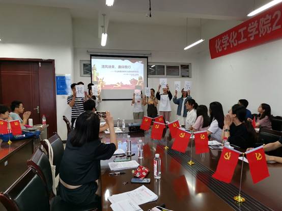 6月14日,化學(xué)工程與工藝學(xué)生第二黨支部以“清風(fēng)徐來(lái),廉伴我行”為主題,舉行了畢業(yè)季廉政教育主題黨組織生活。負(fù)責(zé)聯(lián)系該支部的化工院副院長(zhǎng)張輝與黨支部全體成員共同開展了本次活動(dòng)。 張輝老師首先以理想信念滑坡導(dǎo)致鋃鐺入獄的反面典型案例作為導(dǎo)入談到廉政對(duì)人生的重要意義,他認(rèn)為:“人的認(rèn)識(shí)隨年齡閱歷而不斷發(fā)生變化,但有些人面對(duì)誘惑,沒有守住自己的底線,最終對(duì)社會(huì)造成了危害,悔不當(dāng)初。”他希望學(xué)生黨員在人生觀、價(jià)值觀、世界觀形成的關(guān)鍵時(shí)期,明辨是非、恪守正道,守住自己的底線,為將來(lái)進(jìn)入社會(huì),奠定扎實(shí)的思想根基。接著2015級(jí)王萍萍首先發(fā)言,她從兩個(gè)方面談到了自己對(duì)于廉政的認(rèn)識(shí)。一是為什么黨和國(guó)家強(qiáng)調(diào)廉政,再者就是作為學(xué)生黨員如何看待廉政問題。她說,“廉政是人民對(duì)政府最基本信任的基礎(chǔ),是國(guó)家、執(zhí)政黨擁有威望的有力支撐。對(duì)于畢業(yè)生的我們,出身社會(huì)之后面臨的人員更加復(fù)雜多樣,誘惑更多更大,守住自己的初心和底線就顯得尤為重要。”緊接著,同為15級(jí)畢業(yè)生的唐林茂以漫畫為例,娓娓道來(lái)一個(gè)腐敗官員從小到大,逐步腐敗的故事,從新的角度闡釋了自己對(duì)于廉政的認(rèn)識(shí),“小時(shí)候同學(xué)要我給他作業(yè)抄,我不愿,后來(lái)他給了我一袋糖我就答應(yīng)了;長(zhǎng)大后別人我辦事,我為難,之后連收紅包都變得坦然。”聽完唐林茂的生動(dòng)講述,張輝老師語(yǔ)重心長(zhǎng)地對(duì)同學(xué)們說,生為大學(xué)生,要杜絕弄虛作假,遠(yuǎn)離自作聰明,要正確對(duì)待友誼,不要覺得拿錢辦事就是天經(jīng)地義,任何時(shí)候都不能觸及原則與底線,身為學(xué)生黨員,就要樹立服務(wù)意識(shí),為同學(xué)與校園積極貢獻(xiàn)。 接著,畢業(yè)生黨員曹華,陳浩,榮楊佳,也分別從不同的角度,與大家分享了自己對(duì)于廉政的看法。“作為一名選調(diào)生,我將扎根基層,奉獻(xiàn)國(guó)家,帶著責(zé)任與使命感,踏踏實(shí)實(shí)干好基層黨員工作,在平凡的崗位做不平凡的事。”曹華同學(xué)說起自己未來(lái)的計(jì)劃,擲地有聲,贏得了在座同學(xué)的掌聲。 在畢業(yè)黨員代表發(fā)言之后,新發(fā)展黨員代表馮雪飛,宋雨珍,朱雙同學(xué)也結(jié)合自己與學(xué)長(zhǎng)學(xué)姐的看法經(jīng)驗(yàn)分享了自己對(duì)于廉政的認(rèn)識(shí),立志做誠(chéng)實(shí)守信,廉潔自律的人。 最后,2017級(jí)新發(fā)展黨員集體為畢業(yè)生黨員演唱了一首《北京東路的日子》,祝學(xué)長(zhǎng)學(xué)姐們畢業(yè)快樂,前程似錦,保持初心,不斷進(jìn)步。2015級(jí)畢業(yè)生王萍萍帶領(lǐng)大家進(jìn)行廉潔宣誓。 最后,張輝老師總結(jié)發(fā)言,祝即將畢業(yè)的2019屆黨員前途光明,一切順利,“無(wú)論你們以后身在何處,在何崗位,都要堅(jiān)守本分,牢守底線,嚴(yán)守黨的紀(jì)律,化學(xué)化工學(xué)院將永遠(yuǎn)關(guān)注著你們的成長(zhǎng),希望同學(xué)們不忘初心,展翅飛翔。”(文/宋雨珍 圖/寧嬌)