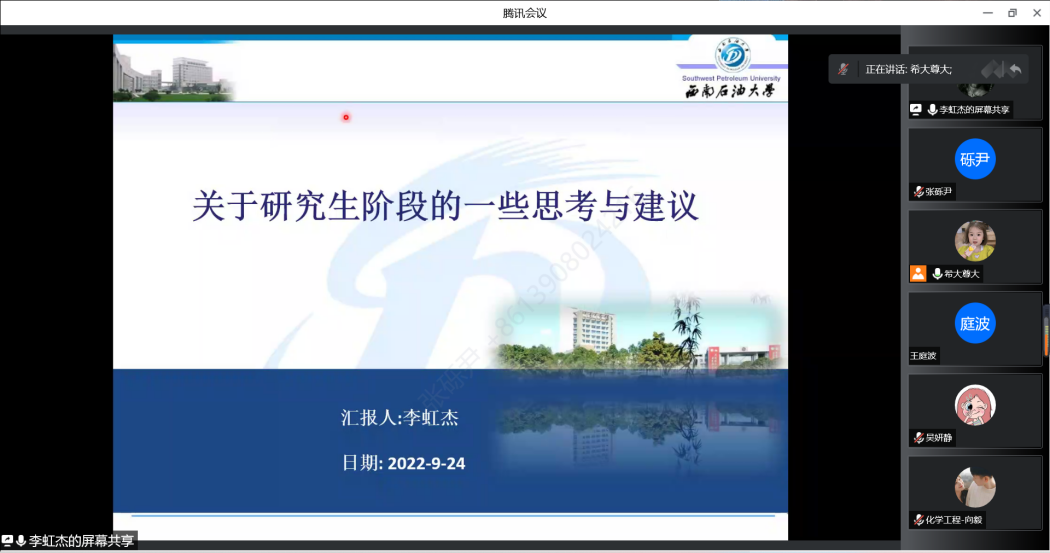 為充分發揮朋輩引領作用,引導研究生新生順利完成角色轉換,盡快適應和規劃好研究生的學習和生活,9月24日晚上,化工院開展線上高年級研究生分享會,會議邀請到了2020級博士生李虹杰和2020級碩士生劉福川兩位學長為新生作分享交流,會議由輔導員程美容主持。 首先是2020級博士生李虹杰為新生分享了自己關于研究生階段的一些思考,他從個人經歷、學術規劃、學生干部經驗和科研競賽這四個方面展開分享。他建議研究生盡早做好職業生涯規劃,知曉碩博士畢業要求,這樣才能清晰的知道自己的目標是什么,當下應該如何度過。然后,他分享了論文的查詢與下載途徑、科研必備軟件的安裝與學習方法,并強調發表論文和英語六級的重要性。此外,李虹杰還分享了學生干部經歷以及參加科研競賽的經歷,鼓勵學弟學妹們積極參加,努力提升綜合素養。 接著,2020級碩士生劉福川為新生作分享交流,他先向同學們拋出了三個小問題“研究生是什么?為什么讀研究生?研究應該怎么讀?”,由此從學習、科研和生活這三個角度分享自己的經驗,他強調研究生不僅需要學好相應的課程,還應重點培養自己的交流能力、文獻查閱技能、實驗技能以及寫作技能。他按照研究方案的制定、研究過程的實施以及研究成果的產出這幾個步驟來具體闡述研究生應該如何做好實驗,如何撰寫論文,如何發表論文,并鼓勵同學們不畏困難、積極嘗試。最后,李虹杰和劉福川表達了對新生的祝福,希望同學們未來三年學有所成、學有所獲。 本次分享會搭建了朋輩輔學的橋梁,高年級的優秀研究生為新生解答了許多疑惑,2022級新生從中受益匪淺。 圖/文:張礫尹 審核:程美容