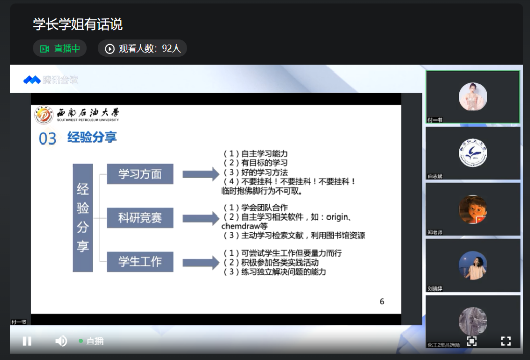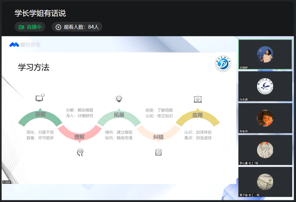為幫助2022級(jí)新生樹立積極樂(lè)觀的學(xué)習(xí)和生活態(tài)度,制定更明確的未來(lái)規(guī)劃和發(fā)展方向,化工院于9月23日晚上于線上舉辦優(yōu)秀畢業(yè)生經(jīng)驗(yàn)交流分享會(huì)。參加本次分享會(huì)的有2018級(jí)優(yōu)秀畢業(yè)生劉曉婷、付一書、孫雷濤、邢皓,以及2022級(jí)全體新生。 首先,劉曉婷由蕭伯納的名言“自我控制是最強(qiáng)者的本能”向同學(xué)們分享不要被身邊的娛樂(lè)誘惑,需變被動(dòng)為主動(dòng)的學(xué)習(xí)態(tài)度,以及如何獲取、理解、拓展、糾錯(cuò)、應(yīng)用知識(shí)的學(xué)習(xí)方法,并且給同學(xué)們提出重視綜合測(cè)評(píng)、積極參加競(jìng)賽、保持較高績(jī)點(diǎn)等建議。隨后,付一書從專業(yè)內(nèi)容、專業(yè)方向等向同學(xué)們介紹了她的專業(yè),并在學(xué)習(xí)需要制定目標(biāo)和科學(xué)的學(xué)習(xí)方法、科研競(jìng)賽學(xué)會(huì)團(tuán)隊(duì)合作、學(xué)生工作獨(dú)立解決問(wèn)題、做好大學(xué)規(guī)劃等方面分享了她的經(jīng)驗(yàn),鼓勵(lì)同學(xué)們認(rèn)準(zhǔn)目標(biāo),為之堅(jiān)持并敢于嘗試。接下來(lái),孫雷濤從學(xué)習(xí)、科研、實(shí)踐方面為同學(xué)們分享了他在大學(xué)的成長(zhǎng)事跡,他以自身為例,課上永遠(yuǎn)都做在第一排、課下翻看課本加深對(duì)知識(shí)的理解、積極參加科研實(shí)驗(yàn)項(xiàng)目并與老師溝通,在課余作為家教工作、參與黨站線上云教學(xué)擔(dān)任講解員等向同學(xué)們表達(dá)了在努力學(xué)習(xí)不斷鞏固知識(shí)的同時(shí),積極向上去成為更好的自己。最后,邢皓分享了他從學(xué)生工作出發(fā)的每一次活動(dòng)、實(shí)踐與匯報(bào)評(píng)比,因首次面試學(xué)生工作失敗而從學(xué)習(xí)、思想、服務(wù)三方面反思并提升自己,因從小被鐵人精神感染而希望成為“小鐵人”堅(jiān)守學(xué)生工作崗位,并鼓勵(lì)同學(xué)們保持自己的初心,在前期的失敗中不要灰心,要從失敗中學(xué)習(xí)到自己的不足且加以完善。 經(jīng)驗(yàn)交流分享會(huì)結(jié)束后,同學(xué)們就學(xué)習(xí)安排、學(xué)習(xí)資源、科研項(xiàng)目等問(wèn)題與學(xué)長(zhǎng)學(xué)姐進(jìn)行了積極的交流。優(yōu)秀的學(xué)長(zhǎng)學(xué)姐以自身經(jīng)驗(yàn)為例,為同學(xué)們撥開剛?cè)氪髮W(xué)進(jìn)行學(xué)習(xí)和生活的迷霧,提供了積極良好的引導(dǎo)作用。 (文/李夢(mèng)婷 圖/李夢(mèng)婷 審核/鄭璇)