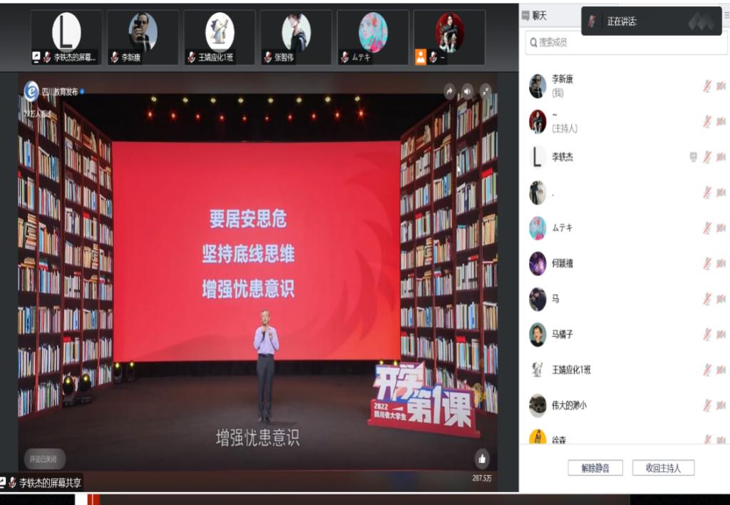 2022年9月22日晚,西南石油大學化工院組織全體2022級新生觀看四川省大學生“開學第一課”,學習習近平總書記來川視察重要指示精神。 節目邀請到了電子科技大學馬克思主義教育學院商繼政教授,四川農業大學水稻所馬均教授,四川師范大學中華傳統文化學院劉俞廷老師,宜賓學院2022屆畢業生劉江同學,四位嘉賓,從糧食安全問題、文化自信問題、就業形勢問題,一同沿著習近平總書記來川視察的路線,進行回顧和解讀,為2022級的新生們提出了一系列值得深思的問題,奉獻了一場精彩絕倫的思政大課。 組織本次線上觀看活動將引導2022級新生用內心感應時代脈搏,用奮斗譜寫青春樂章。更激勵了新生以滿腔的熱情、飽滿的精神和堅定的信心,迎接新學期的挑戰、開拓奮進。 (文/馬超前 圖/馬超前 審核/鄭璇)