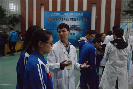 新都一中師生在學(xué)院領(lǐng)導(dǎo)及志愿者的帶領(lǐng)下,參觀了校史館、工程實踐中心,體驗了在中學(xué)校園里難以體驗到的鐵人精神與專業(yè)實踐精神。在工程實踐中心,葉仲斌院長親自給同學(xué)們介紹了石油井架原理及用途以及在石油產(chǎn)業(yè)鏈中,與化學(xué)的緊密聯(lián)系?;ぴ禾其]磊博士在明德樓a318教室以“從石油到餐桌—化工與我們”為主題,陳鑫博士現(xiàn)場演示了分子、原子組合構(gòu)建的奧秘,兩位老師講述了學(xué)院與各大石油企業(yè)單位的合作,并以21世紀(jì)的發(fā)展主題,開啟了探索“能源,環(huán)境,生命,材料”之旅旅程。廣大中學(xué)生走進化學(xué)化工國家級實驗教學(xué)示范中心體驗化學(xué)實驗的魅力。