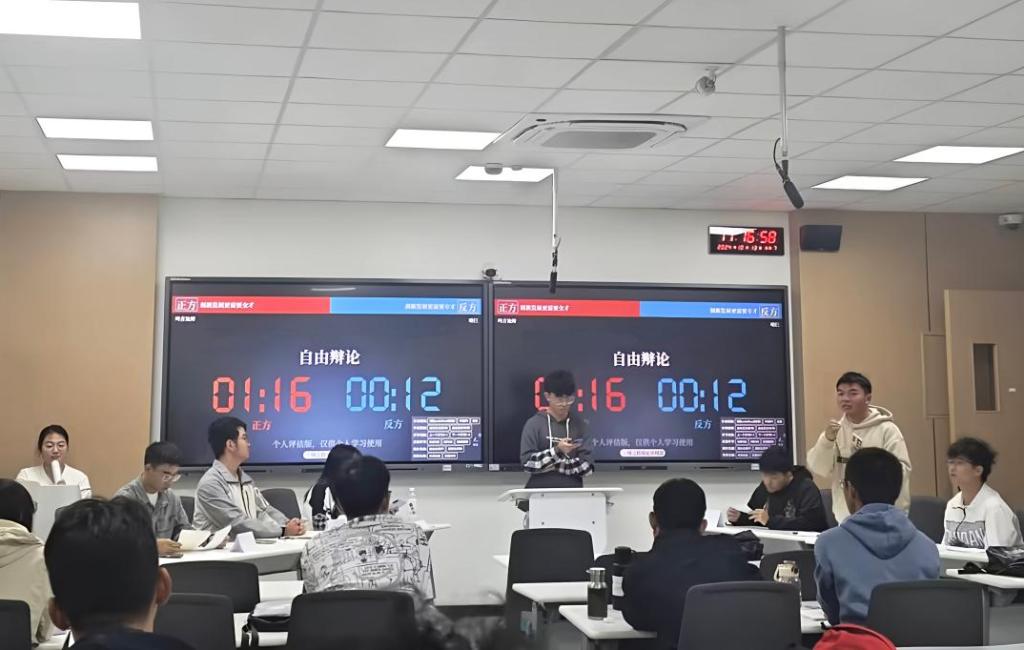 圖4:輔導(dǎo)員白志斌和學(xué)生共唱《我的祖國(guó)》 “這個(gè)班級(jí)真厲害,班會(huì)開(kāi)成辯論賽。”在2023級(jí)應(yīng)用化學(xué)3班內(nèi),一場(chǎng)別開(kāi)生面的主題班會(huì)正以辯論賽的形式熱烈展開(kāi)。圍繞“創(chuàng)新需要全才還是專才”,輔導(dǎo)員程美容將同學(xué)們分成兩隊(duì),讓雙方就各自立場(chǎng)展開(kāi)充分討論。唇槍舌劍,引經(jīng)據(jù)典,據(jù)理力爭(zhēng),辯論賽不僅鍛煉了同學(xué)們的邏輯思辨能力、語(yǔ)言表達(dá)技巧,更深化了其對(duì)“創(chuàng)新”、“人才”等核心概念的理解。互動(dòng)式、思辨式的主題班會(huì)讓育人的效度與深度極大提升。