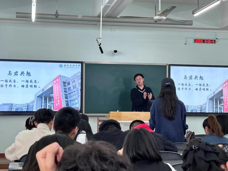 圖2:2021級(jí)化學(xué)工程與工藝卓越班朗誦《我愛(ài)這土地》 “這是一場(chǎng)跨越66年的對(duì)話”,在2024級(jí)研究生“星火賦能·校友面對(duì)面”主題班會(huì)上來(lái)了一位神秘嘉賓——我校58級(jí)校友、西南石油大學(xué)教授、博士生導(dǎo)師張明洪老學(xué)長(zhǎng)重返校園,走進(jìn)研究生主題班會(huì),傾情講述老一輩石油人“為石油而生,為石油而息”的奮斗歷程,勉勵(lì)小師弟師妹們賡續(xù)石油精神,勇?lián)鷱?qiáng)國(guó)使命,矢志追求卓越,“讓青春的熊熊之火,在為使母校早日成為世界一流學(xué)科、一流能源大學(xué)和百年名校的壯麗事業(yè)中激情燃燒!”
