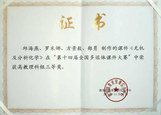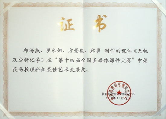 我院邱海燕等四位老師的《無機及分析化學》課件獲得第十四屆全國多媒體課件大賽理科組三等獎和最佳藝術效果單項獎