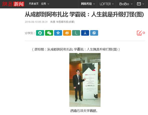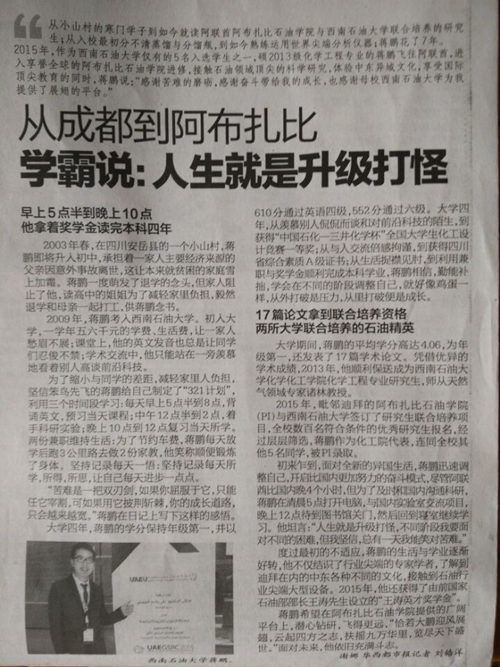 近日,《華西都市報》、網易新聞報道了我?;瘜W化工學院2016屆畢業生蔣鵬的成長事跡。 從初入大學,全家人東拼西湊交學費,到求學7年,以平均學分4.06、17篇學術論文的成績,拿到累計十余萬的獎學金完成學業,改善家人生活;從一個來自四川安岳縣小山村的寒門學子,到如今阿聯酋阿布扎比學院與西南石油大學聯合培養的研究生,還在2015年代表化學化工學院,作為西南石油大學唯一一名獲獎研究生,獲得了前國家石油部部長王濤先生設立的“王濤英才獎學金”。