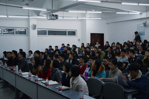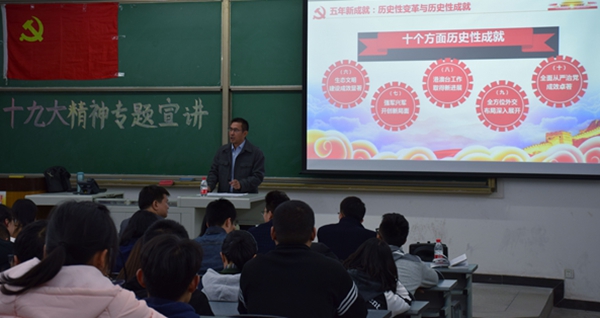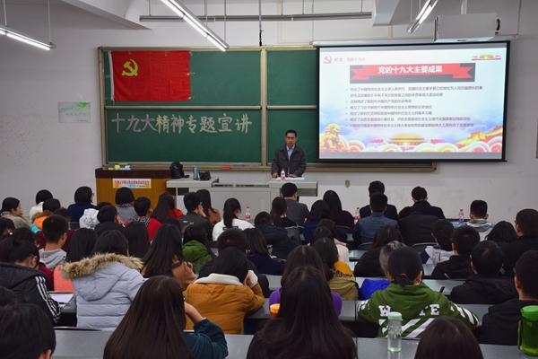 | 我院舉辦十九大精神宣講會2017-11-23  作者:  編輯:蒲冠州  審核:  瀏覽:[]  11月22日晚,我院邀請到學校十九大精神宣講團成員、學生工作部(研究生工作部)(處)部(處)長蒲勇向學院全體學工教師、全體學生黨員、黨員服務站成員作了“深入學習貫徹黨的十九大精神,增強責任擔當,不辱歷史使命,為實現中華民族偉大復興中國夢而努力奮斗”為主題的十九大精神宣傳報告。 蒲勇從五年新成就、方位新判斷、理論新成果、發展新征程、矛盾新變化、時代新使命、呼喚新作為7個方面,對十九大報告的內容進行了系統闡釋和深入解讀。他在宣講最后對同學們提出了三點希望:胸懷理想信念,自覺走新時代中國特色社會主義道路;勤于學習實踐,努力錘煉服務祖國和人民的真本領;善于創新創業,努力成為創新驅動發展的生力軍。 學院黨員公寓服務站負責人曾雅清表示,通過蒲部長通俗樸實的語言、旁征博引的講解,自己更加深入地理解了黨的十九大精神,也將把十九大精神落實到日常的學習工作中。 學院黨委副書記蒲冠州在會后表示,認真學習宣傳貫徹黨的十九大精神,是當前和今后一個時期學校和我院的首要政治任務。我們要深刻領會黨的十九大精神實質,自覺以黨的十九大精神武裝頭腦、指導實踐、推動工作。 自十九大召開至今,化學化工學院通過“線上線下齊發聲”的模式,在全院師生中積極進行十九大精神宣講:線上通過《先鋒集結號》專欄推送《關于十九大報告,你必須知道的“關鍵詞”》等文章,微博直播“不忘初心,方得始終——十九大學習分享交流會”;線下以學生黨員公寓服務站暨先鋒集結工作室為宣傳陣地,在學生中開展十九大精神宣講會等,助力師生深入了解十九大精神內涵及實質。