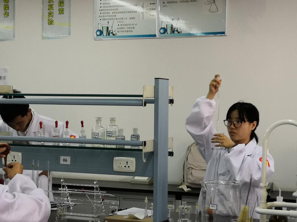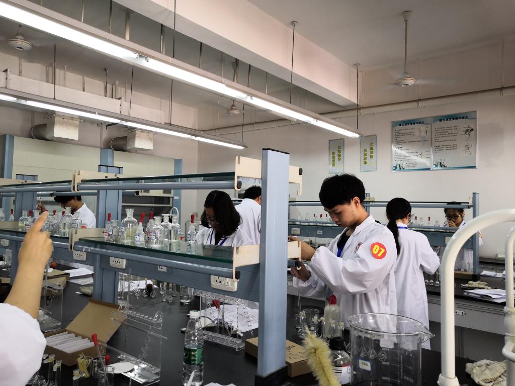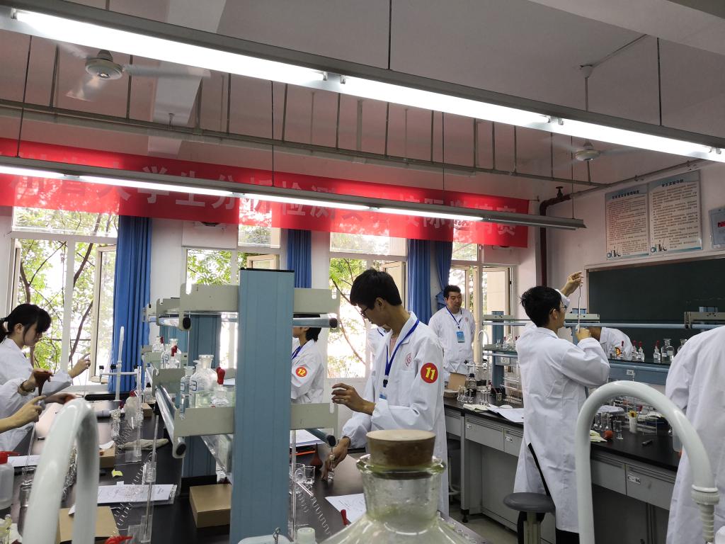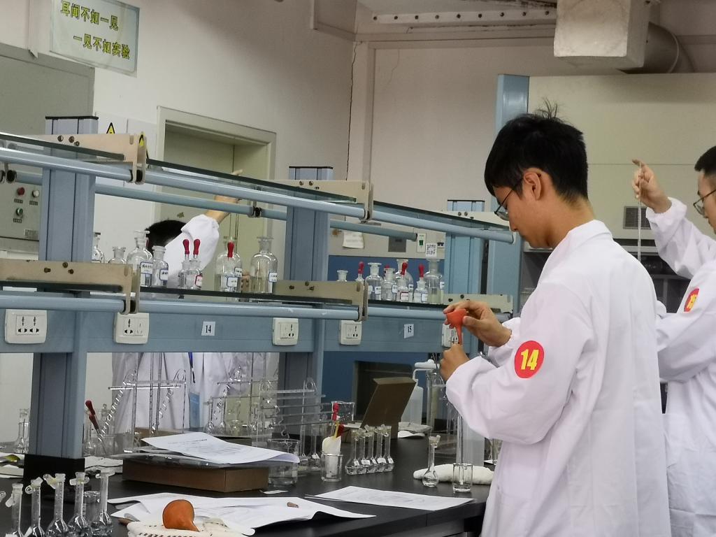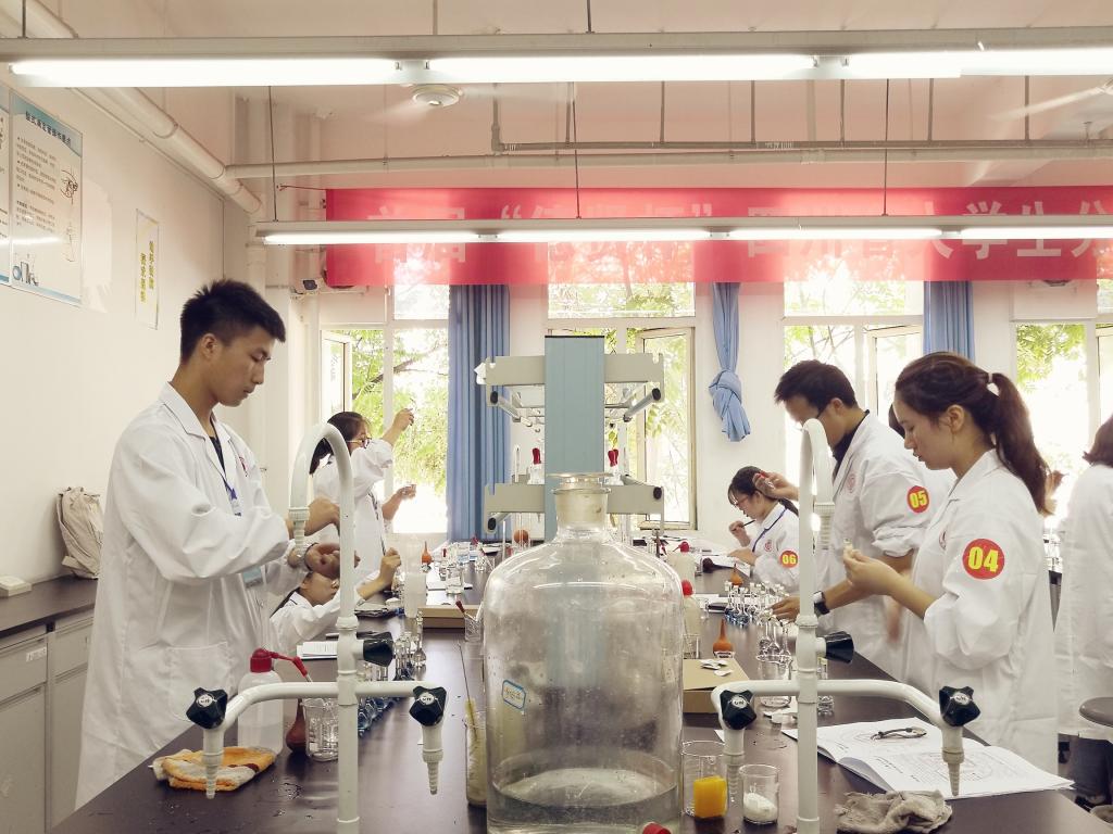 圖1:參賽同學與帶隊教師合影留念 大賽共有來自四川大學、成都理工大學、四川農業大學、西華大學等6所高校的18支優秀隊伍同場競技。比賽總共分為兩個環節,即筆試與實驗操作考試。筆試涵蓋包括無機化學、有機化學、物理化學、分析化學理論測試;實驗操作考試涵蓋化學分析及儀器分析。競賽較全面的考察了各參賽隊員的理論基礎與實驗操作綜合素養。 在此次競賽準備階段,段文猛老師、邱海燕老師、熊艷老師、朱鵬飛老師均對參賽同學進行了專業細致的指導培訓,參賽同學也在繁重的專業課程學習之余,積極準備、認真練習實驗操作技能,賽后參賽隊員也一致認為通過集中培訓,自己的實驗操作素養有了極大提高,這無疑對自己將來的科研之路打下了堅實的基礎,但與此同時,更應該充分認識到自己存在的不足,將理論所學與實驗操作真正結合,不斷發現問題,糾正錯誤習慣,使自己的實驗操作技能不斷完善。(文/鄭冠祺)
