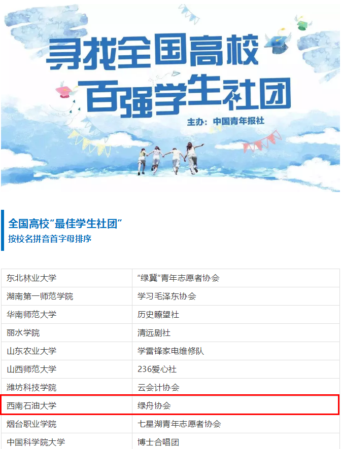 | 化工院綠舟協會獲全國高校“最佳學生社團”稱號2018-06-25  作者:  編輯:陳剛  審核:  瀏覽:[]  日前,由中國青年報社主辦的“尋找全國高校百強學生社團”活動已落下帷幕。經過高校推薦、社團自薦、社團展示、網絡投票、技術篩查、專家評審等環節后,全國高校百強學生社團名單出爐,我校化工院綠舟協會入選全國高校百強學生社團,并獲得全國高校“最佳學生社團”稱號(全國僅10所)。 化工院綠舟協會作為西南石油大學2017~2018學年度星級品牌社團創建活動五星社團,成立于2001年11月8日嘉陵江畔,自成立之日起,協會一直秉承著“共舞綠色夢想,共建和諧家園”的理念為環境保護貢獻著自己的力量。在風風雨雨15年的歷程中,綠舟協會不斷開闊進去,銳意創新,組織了一系列以環境保護、熱愛自然為宗旨的校內校外活動,先后與成都同心互惠、地球媽媽、CYCAN、一天公益、香港環境保護協會等公益組織合辦活動,與四川大學、電子科技大學、華中林業科技大學等高校合作交流,活動獲得了新都電視臺,成都電視臺,成都晚報的廣泛報道,更受到新都環保局,共青團中央的廣泛認可。 《中國青年報》報道鏈接:https://mp.weixin.qq.com/s/D0O3sGpGmWP9NBwhVaMjOw