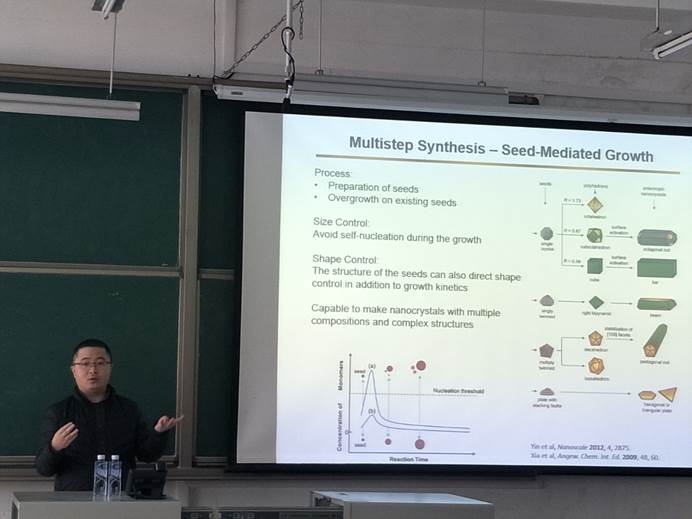 12月3日,應我校科研處、化學化工學院和油氣田應用化學省重點實驗室邀請,美國密歇根大學博士后劉一丁研究員來到我校作了一場題為“貴金屬納米粒子的可逆組裝及其應用”的學術報告。化工院院長助理全紅平和部分師生參加了報告會。 從金屬納米粒子在檸檬酸中的自組裝到金屬納米粒在半導體光催化領域的特殊應用,劉一丁研究員詳細闡述了金屬納米研究的總體思路與發展前景,并就粒子組裝、粒子還原修飾與相關反應機理等問題與師生們進行深入探討。劉一丁研究員嚴謹的科學思維與豐富的研究經驗讓學生們深受啟發,也使得同學們對貴金屬納米粒子的相關知識有了進一步了解。 本次學術講座提為同學們提供了新的研究思路與見解,為同學們今后的科研道路提供了寶貴的經驗。(文/劉羚、張晨 圖/劉羚) 劉一丁研究員簡介: 劉一丁研究員現為陸軍軍醫大學第二附屬醫院研究員,2010年獲中國科學技術大學材料物理學士學位,2015年獲加州大學河濱分校博士學位,美國密歇根大學博士后。主要致力于納米材料的自組裝及其應用,以及功能納米材料在能源與催化方面應用的研究。先后在Angew.Chem.、JACS、ACSNano、Chem、Soc.Rew.等期刊發表SCI論文10余篇,總被引達1300多次,曾兩度獲美國材料研究會(MRS)優秀研究生獎。