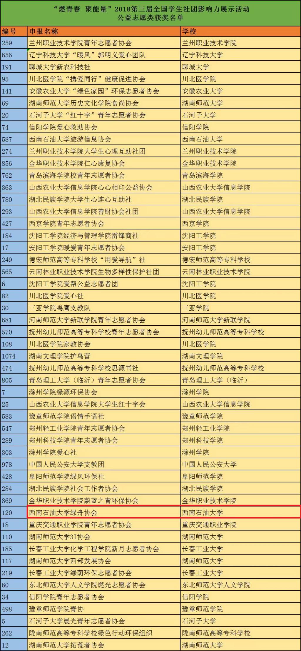 日前,在中國共青團中央網絡影視中心和未來網主辦的“‘燃青春 聚能量’2018年第三屆全國學生社團影響力展示活動”中,我校化工院綠舟協會入選全國學生最具影響力公益志愿社團,并獲得全國學生“最具影響力公益志愿社團”稱號。 化工院綠舟協會作為西南石油大學2017~2018學年度星級品牌社團創建活動五星社團,成立于2001年11月8日嘉陵江畔,自成立之日起,協會一直秉承著“共舞綠色夢想,共建和諧家園”的理念為環境保護貢獻著自己的力量。在風風雨雨15年的歷程中,綠舟協會不斷開闊進去,銳意創新,組織了一系列以環境保護、熱愛自然為宗旨的校內校外活動,先后與成都同心互惠、地球媽媽、CYCAN、一天公益、香港環境保護協會等公益組織合辦活動,與四川大學、電子科技大學、華中林業科技大學等高校合作交流,活動獲得了新都電視臺,成都電視臺,成都晚報的廣泛報道,更受到新都環保局,共青團中央的廣泛認可。 全國學生最具影響力公益志愿社團(名單不分先后):