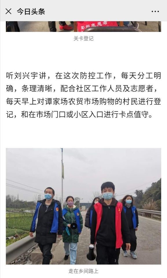 “今日頭條”報(bào)道截圖(左一為向前錦) 除了人手壓力,應(yīng)用化學(xué)2019級(jí)的志愿者袁浩偉還面臨著“鄉(xiāng)親不理解”的問題,由于農(nóng)村居民部分防控意識(shí)弱,又受“人情大于天”的觀念影響,鄉(xiāng)村防控變得困難重重。袁浩偉就在身為老黨員的父親的帶領(lǐng)下,每天早上5點(diǎn)就到田間地頭挨個(gè)宣講,發(fā)放出入證明,凍紅了的雙耳見證了他為疫情防控所做的努力。