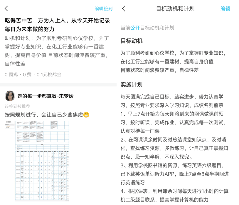 同學預習筆記 線上學習更注重個人學習主動性與前期的準備?;?span lang="EN-US">2018級三班的同學們還創建了“目標動機和計劃”公開版,大家在公開版上樹立目標,制定計劃并進行自我反思。宋夢嬡表示“要想跟上老師的節奏,必須提前預習,同時,每堂課后還要及時消化。”于是,宋夢嬡在內的同學們,根據老師的指導,提前自主安排學習活動(上課前規劃好預習時間,備齊學習資料,課后及時通過聯絡群中的學習資源進行自我檢測,有同學在公開版上寫到:“吃得苦中苦,方為人上人,從今天開始記錄每日為未來做的努力。”