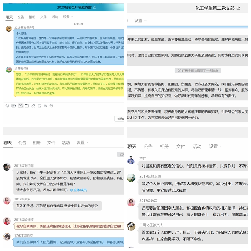同學們交流分享截圖 線上收看學習,線下更要積極踐行。早在1月23日,化工2017級學生黨員卿成林就主動報名成為了抗疫志愿者。但志愿工作并未隨著假期結束而終止,作為學生會主席的他,發起了線上“青年云抗疫”活動,面向全校青年學生發起防控倡議,發布抗疫防疫手冊等。這堂思政課讓他更堅定了自己的決定:“疫情這場大考沒有打垮我們,反而讓95后的我們更堅定了在中國共產黨帶領下抗疫必勝的信心和實現‘中國夢’的決心,為此,身為黨員的我更應該做好示范,擔起責任,積極發聲,爭當疫情群防群控的‘戰斗員’‘宣傳員’‘保障員’。”
