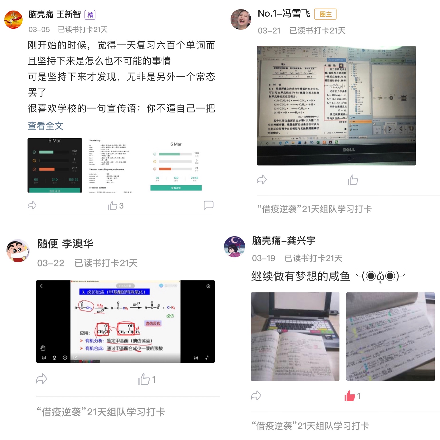 化工院深入學習貫徹習近平總書記重要指示精神,堅決貫徹黨中央關于新冠肺炎疫情防控各項決策部署,充分利用多樣化、廣覆蓋的融媒體矩陣,努力把疫情危機轉化為教育契機。充分發揮學生黨員率先垂范的示范引領作用,以“云黨建”為依托,引領廣大青年學生同心“戰疫”、愛國力行。 開展“云輔學”,以線下標準抓好線上學風。化工院學生黨員率先垂范,基于網絡平臺營造優良學風。一是開展“云上輔學團”直播輔學活動?;ぴ簝炐泓h員同學自發成立“云上輔學團”,結合不同年級學生特點及需求,針對大一有機化學、高等數學,大二化工原理、物理化學開設直播答疑,梳理課程重難點,幫助同學們質量不減、標準不降地完成學習任務,真正做到“學習不停、科研不止”。目前,“云上輔學團”直播輔學已開展第五期,每期參與人數均維持在200人以上。后期,將同步面向大三開設學科競賽軟件培訓直播,大四開設就業心理調適、考公考研經驗分享、簡歷制作等直播課程。二是開展“攜手共進,共抗疫情”組隊學習活動。黨員同學帶頭自發組成為期21天的五人打卡小組,小組包括:科研競賽小組、鍛煉監督小組、學習幫扶小組、就業指導小組、考研分享小組、英語晨讀小組等,組長負責進行督促記錄,互幫互助,共同成長。三是創建“目標動機和計劃”公開版,全體學生黨員率先在公開版上樹立目標,制定計劃并進行自我反思,引領廣大同學從“要我學”到“我要學”的轉變。