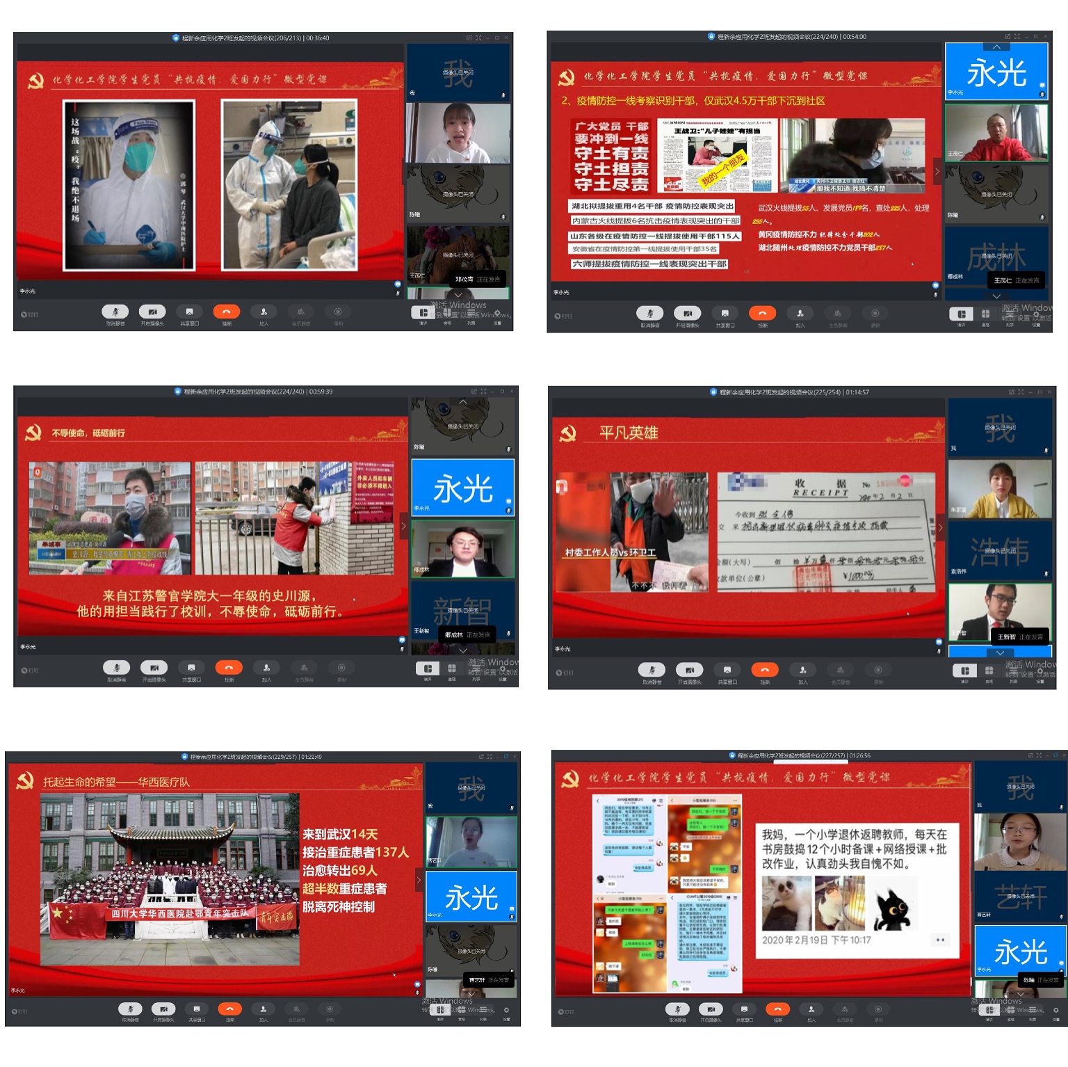 開展“云黨課”,讓黨旗在防控一線高高飄揚。化工院學生黨員開展“共抗疫情·愛國力行”微黨課公開巡講,透過正發生在中國的火熱事件,將疫情防控工作涌現的案例轉化為鮮活課堂。6位巡講黨員向同學們講述了疫情戰役中的感人故事。應用化學第一黨支部黨員鄧茂清同學講述了抗擊疫情期間英雄醫護的故事;博士研究生黨支部王茂仁同學通過自己身處武漢的經歷,分享從湖北籍學生視角看待中國制度優勢;化學工程與工藝第二黨支部卿成林同學講述了疫情期間無怨付出的大學生志愿者的故事;化學黨支部王新智同學分享了疫情期間各類平凡英雄的故事;博士研究生黨支部曹藝軒同學講述了援鄂醫療隊的故事;化學工程與工藝第一黨支部陳曦同學講述了疫情期間高校教師堅守崗位職責的感人故事。后續化工院微黨課巡講團成員還將進支部、進班級、進社區、進新生群體中,通過青年黨員的發聲講述防疫戰役一線的感人故事,認真講好一方有難、八方支援的大愛壯舉。