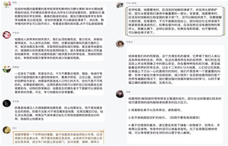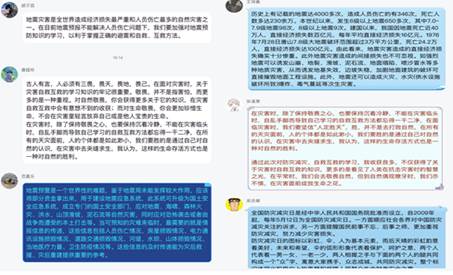 線上班會截圖 活動期間,各班學生也在班級QQ群、QQ空間、微信朋友圈等社交平臺就地震、新冠疫情防控等熱點話題,就如何做好突發災害的有效應對發表自己的看法。