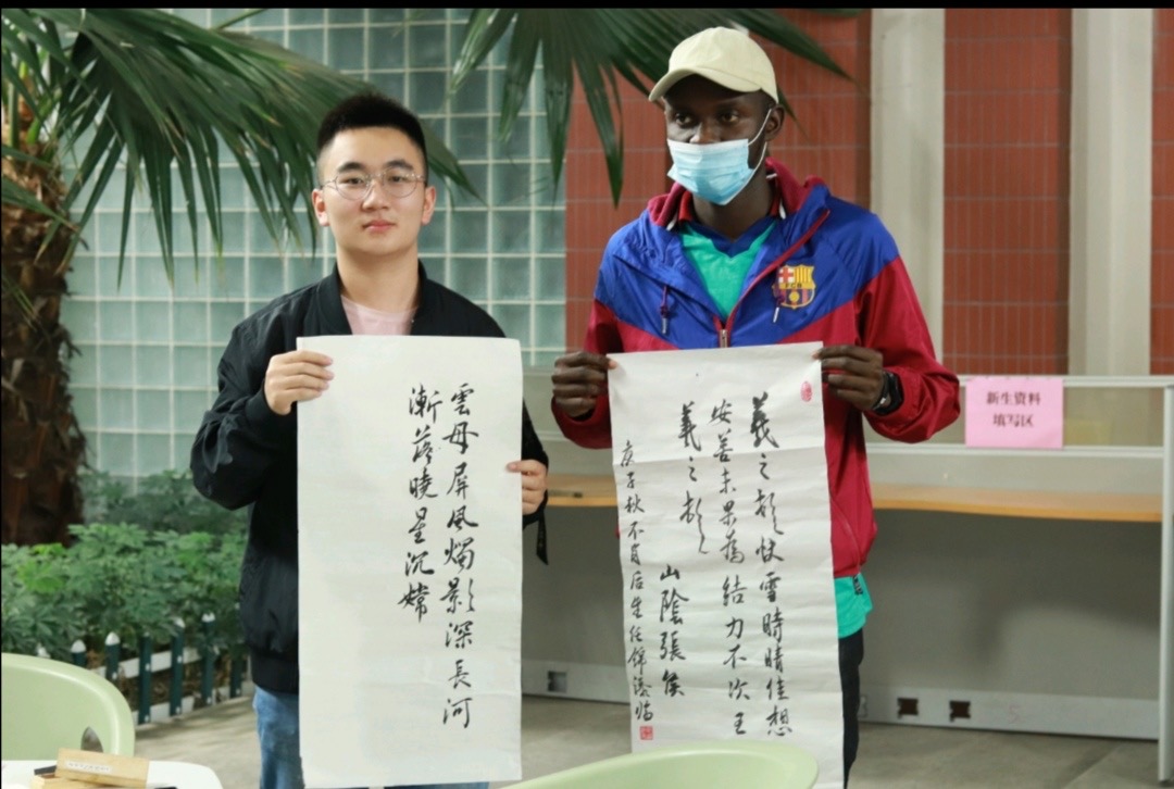 圖 同學們朗誦《中秋賦》 隨后,任錦添和王琦同學為大家展示了自己創作的傳統書法及剪紙作品,令不少留學生拍手贊嘆。在場學生也在兩位同學的指導下進行了書法和剪紙的初體驗。