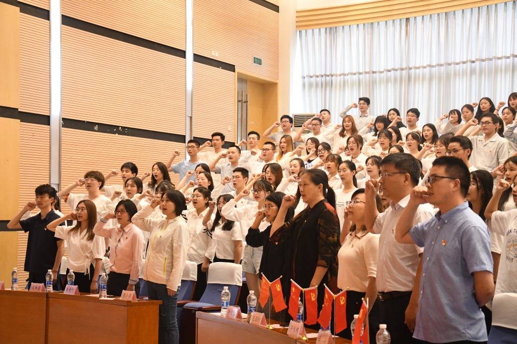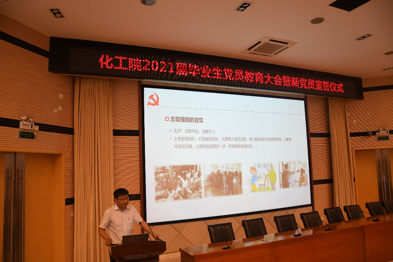 6月17日14:30,化工院2021屆畢業生黨員教育大會暨新黨員宣誓儀式在思學樓A114成功舉行。學院黨委書記王兵、黨委副書記陳剛出席,全體師生黨支部書記、2021屆畢業生黨員、新發展黨員等240余人參加。大會由學院黨委副書記陳剛主持。 活動伊始,全體黨員起立,奏唱國際歌。隨后,在陳剛的帶領下,2021年春季學期新發展黨員進行了入黨宣誓,全體畢業生黨員一同重溫入黨誓詞。 應用化學2019級學生粱奕寧代表新發展黨員發言,她通過分享自身入黨的心路歷程,講述自己一絲不茍的學習態度,表明了自身服務大眾、奉獻社會的入黨初心,表示將始終保持思想先進性,爭做合格共產黨員。 作為中國大學生年度人物提名獎、中國大學生“自強之星”、四川省“易青春五四青年榜樣”、成都市“疫情防控青年突擊手”等榮譽獲得者,化學工程與工藝2021屆畢業生卿成林講述了積極向黨組織靠攏的奮斗歷程,分享了疫情期間為社區疫情防控所做的點點滴滴,號召全體青年黨員時刻牢記時代使命與歷史責任,勇敢沖鋒在中國特色社會主義事業建設最前線。 老黨員代表、化工教研室黨支部書記余亞蘭老師寄語即將離開母校走向工作崗位的畢業生黨員。她講到:“中國并不是只有一個人在工作,而是千千萬萬人凝聚力量攻堅克難,希望各位同志在工作中要懂得珍惜與分享,正視自己在某些方面的不足并努力向優秀看齊,立大志、明大德、成大才、擔大任,實現人生價值。” 王兵代表學院黨委向完成學業的全體2021屆畢業生黨員表示衷心祝賀,向2021年春季學期新發展黨員提出要求和期許,希望他們在以后的工作和學習中要永葆紅色本性,時刻牢記自己的入黨初心,努力成長為堪當民族復興大任的時代新人。他指出,作為新時代的共產黨員,我們一定要將先鋒模范帶頭作用時刻內化于心、外化于行,在平凡的工作崗位上樹立青春旗幟,綻放絢麗的青春之花。 本次黨課是化工院2021屆畢業生離校系列活動的重要組成部分,有利于增強畢業生黨員政治覺悟與道德信念,繼承和發揚以老帶新優秀傳統,進一步提高我院黨員教育管理工作水平。(文/王柯瑯 楊舒寒 圖/宋傲鵬)