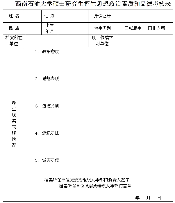 注:1、所填內容一經涂改,本表無效。 2、考生姓名、工作或學習單位、檔案所在單位等基本信息必須與該生報名時所填內容一致。 3、本表請考生自行從網上下載并用A4紙打印填寫一份,由檔案所在單位填寫并密封。在復試時交復試學院,復試學院查驗存檔備查。 4、本表信息若有虛假、涂改,將取消考生的復試、錄取資格。 5、應屆畢業考生,此表由其就讀學校的院(系)黨組織填寫;非應屆考生,此表由其檔案所在單位黨委或組織人事部門負責人或戶口所在地社區黨組織填寫,且所蓋公章應與報考信息所填檔案所在單位一致。