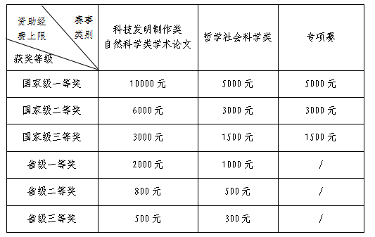 3、本次“挑戰(zhàn)杯”校內(nèi)選拔賽參賽作品的立項(xiàng)資助以成果為導(dǎo)向,資助獲得省級(jí)及以上獎(jiǎng)項(xiàng)的優(yōu)秀作品。按照審批的作品經(jīng)費(fèi)預(yù)算(經(jīng)費(fèi)預(yù)算表見附件4),在資助經(jīng)費(fèi)上限和學(xué)校財(cái)務(wù)報(bào)銷規(guī)定的范圍內(nèi),資助經(jīng)費(fèi)實(shí)行實(shí)報(bào)實(shí)銷原則。不同類別、不同獎(jiǎng)項(xiàng)的資助經(jīng)費(fèi)上限見表2。 表2 不同類別、不同獎(jiǎng)項(xiàng)的資助經(jīng)費(fèi)上限明細(xì)表