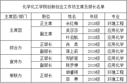 為保證化工院創(chuàng)新創(chuàng)業(yè)部分學生工作的順利開展,積極響應學校“大眾創(chuàng)業(yè),教育先行;萬眾創(chuàng)新,文化引領(lǐng)”的號召,緊緊圍繞學生工作的新特點和新要求,充分體現(xiàn)學生組織的自我教育、自我管理、自我服務(wù)的宗旨,結(jié)合我院實際情況,本著“公平、公正、公開”的原則,經(jīng)學生自主報名,在全院范圍內(nèi)進行公開選拔。通過資格審核和面試等環(huán)節(jié),第五屆創(chuàng)新創(chuàng)業(yè)工作坊主席、部長已選拔完畢。現(xiàn)將換屆結(jié)果公示如下: 一、結(jié)果