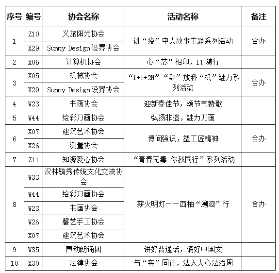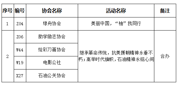 根據《關于開展西南石油大學2020年秋季學期學生社團素質拓展活動和品牌活動申報的通知》的要求,經評審工作小組研究決定,擬評選出品牌活動2個、素質拓展活動10個,現將結果公示如下: 一、品牌活動名單(2個)