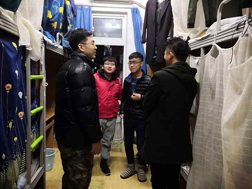 為進(jìn)一步加強(qiáng)寢室管理,鞏固開學(xué)前檢查成果,培養(yǎng)學(xué)生良好的生活習(xí)慣。3月10日21:00化工院15級(jí)輔導(dǎo)員闞文華和曾雅清分別帶領(lǐng)學(xué)工助理對(duì)2015級(jí)男生寢室進(jìn)行檢查。 學(xué)期伊始是促進(jìn)寢室管理規(guī)范化,提升寢室文化品位,創(chuàng)建和諧、衛(wèi)生的寢室環(huán)境的關(guān)鍵時(shí)期。兩位老師對(duì)寢室衛(wèi)生,用電安全等進(jìn)行了詳細(xì)檢查,并對(duì)內(nèi)務(wù)較差的寢室提出現(xiàn)場(chǎng)整改的要求。在檢查內(nèi)務(wù)的同時(shí)兩位老師就考研復(fù)試,就業(yè)以及畢業(yè)等相關(guān)問題進(jìn)行了交流,勉勵(lì)復(fù)試的同學(xué)們積極準(zhǔn)備,爭(zhēng)取考進(jìn)心儀的學(xué)校,鼓勵(lì)選擇就業(yè)的同學(xué)們多了解就業(yè)動(dòng)態(tài),把握機(jī)會(huì)。(文/仇天富)