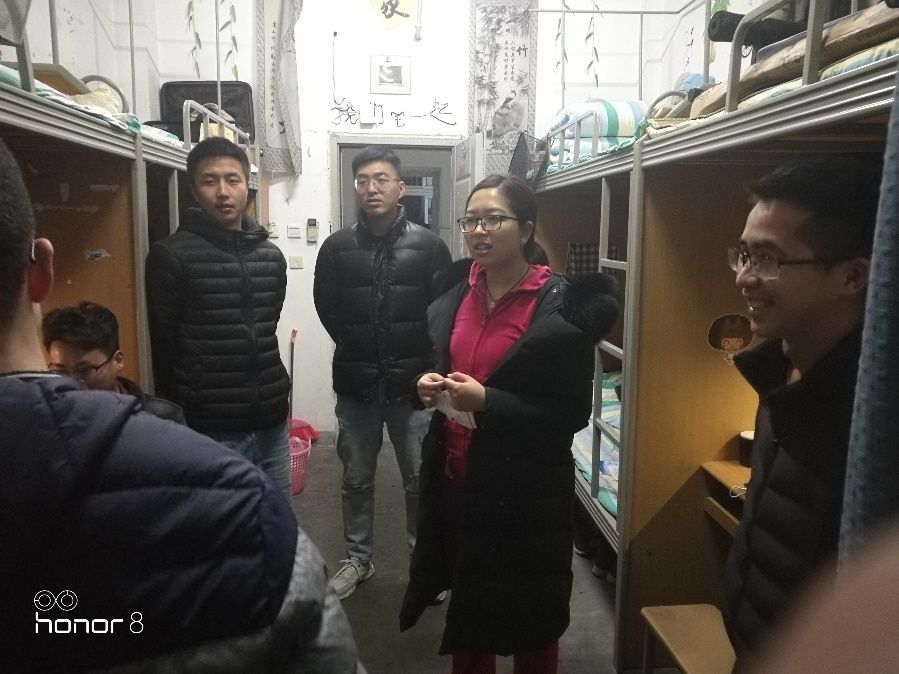 為加強寢室管理,培養學生良好的生活習慣,營造健康文明、和諧有序的學習生活環境。3月24日21:00化工院15級輔導員闞文華和曾雅清兩位老師對2015級男生寢室進行例行檢查,同時全面了解學生就業及研究生復試情況。 寢室安全關乎每一個學生的切身利益,為了督促學生做好寢室內務,全面消除寢室安全隱患,2015級深入貫徹學校各項規章制度,制定寢室日常檢查制度,每周日晚上進行寢室檢查和走訪。 檢查過程中兩位老師對寢室衛生,用電安全等進行了詳細檢查,并對內務較差的寢室提出批評并要求現場整改。在檢查內務的同時,兩位老師詳細了解了目前研究生復試及就業情況,為同學們把方向,找途徑,提建議。(文/仇天富)
