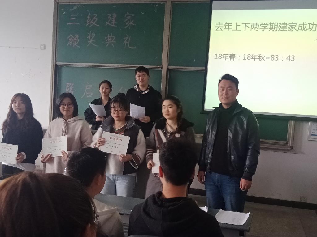 儀式開始,和晉為2018-2019學年秋季學期合格之家與優秀之家建家成功的寢室頒發了榮譽證書,并與同學們就寢室文化建設的重要性進行了交流。他說到,寢室是大學生成長學習的重要場所,學院持續開展三級建家活動是為了引導同學們養成講文明、講衛生、守紀律的良好習慣,培養大家文明、健康的生活方式,促進良好寢室學習氛圍的養成。他希望每個寢室都能踴躍參與進來,在遵守學校規章制度的前提下提升生活品質,杜絕使用大功率電器,共建文明寢室。同時,和晉指出各班生活委員應肩負督促管理班級同學寢室內務的重任,增強自我認同感,帶動同學們養成良好的學習及生活習慣。 最后,主持人為同學們講解了學院三級建家的報名流程、實施細則和創建標準,主要包括內務衛生、行為禮儀、人際交往、學習方面等方面的要求,鼓勵同學們要積極參加活動,爭取在活動中建家成功。(文/王宇琦 圖/張冬梅)