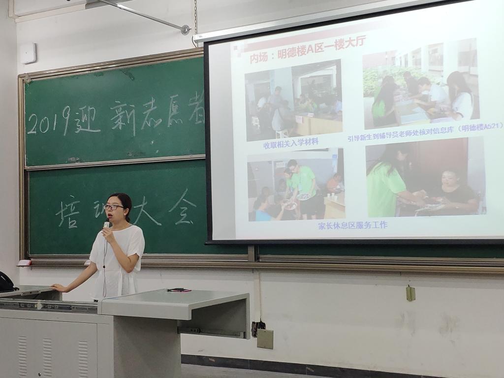 | 化工院召開2019迎新志愿者培訓大會2019-09-03  作者:文/秦佳雯 圖/朱瑋  編輯:陳剛  審核:  瀏覽:[]  為做好2019年迎新各項工作準備,提高迎新志愿者服務意識水平,9月2日晚20:45,化工院于明德樓A312召開了迎新志愿者培訓大會。 培訓會上,新生輔導員曾雅清就19級新生概況、迎新工作開展時間、迎新地點及迎新工作注意事項等進行了說明。會議期間,曾雅清強調,在迎新外場值班的志愿者要帶著新生逐步進行完所有報到程序;內場的志愿者一定要認真負責地做好新生檔案接收工作。曾雅清說到:“我們每個人都是從新生一路走來的,希望大家能夠將曾經收到的愛與關懷傳遞下去,懷著高度的責任感投入到工作中,讓新生在入校初期少一些不適,多一些歸屬感。” 隨后,輔導員曾雅清和張銘分別就班導生的工作安排以及學校迎新系統的操作方式為班導生及相關負責同學進行了詳細講解,強調要將迎新工作落到實處。 培訓會結束后,新生班導生李周緣表示:“經過今天的培訓會,我感受到了我身上的擔子的重量,我和我的伙伴們,一定都會盡自己最大努力完成迎新工作的!”(文/秦佳雯 圖/朱瑋)