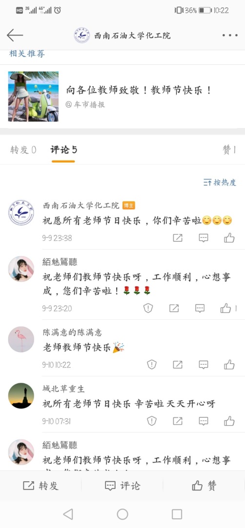 學生在學院微博留言祝福 集體祝福謝師恩。 在活動期間,化工院組織各團支部利用上課前后及課間時間,采用起立祝福、歌唱師恩、給教師一個大大的擁抱等方式表達了對教師的感謝與祝福,當老師們收到這些祝福的時候,都不由自主地流露出感動的笑容與幸福的淚水。